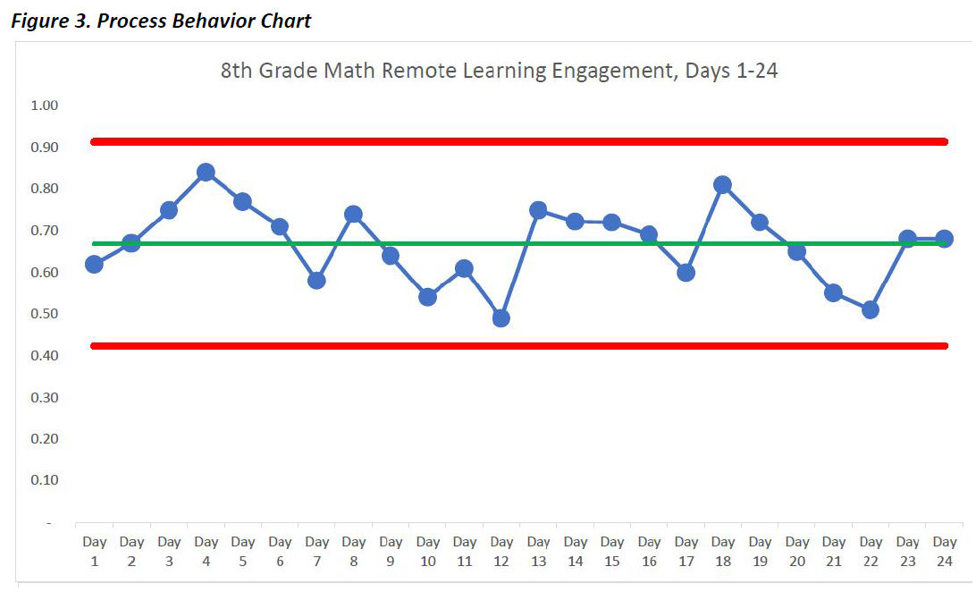 In looking at the eighth grade math engagement rates, we can learn a few important things. First, the data indicate a stable system because the plotted points for the first 24 days remain between the red control limits (there are other rules for interpreting the data, but those are beyond the scope of this article). This means that we can reasonably expect that the engagement levels for this eighth grade math class will produce similar results over time, and now that we have the data through the first third of the school year, that is mostly what we see. Second, in the first 24 days of remote learning, we don’t see any signals of special events in the data. One indicator of a signal would be a single point outside of the red control limits. This means that there haven’t been any significant events, either in a positive or a negative direction, to attend to in this eighth grade math remote learning system. Third, and most importantly, if we are not satisfied with the overall engagement levels in eighth grade math then we have to work together as a team on improving the system that is producing those results.