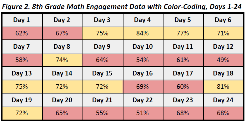 I don’t view Figure 2 as a better version of Figure 1. I actually think when you add the color-coded system you actually increase the likelihood of tampering such as when there is an overreaction to single data points based on the arbitrary scale. There are a couple of reasons for this. First, are the values that would be color-coded as “green” actually good enough? What if there was a day that you had 85% engagement? This means that 15% of the students in the 8th grade did not engage on that particular day. This has the potential to become a problem if the arbitrary goal of 85% becomes something to aspire to. A second issue is the inability to differentiate between meaningful differences in engagement levels. For example, on Day 15 the engagement rate was 72% and color-coded yellow. On the very next day it was 69% and coded red. An elementary student could tell me that 72% is 3% higher than 69%, but that information is virtually meaningless. What we really need to know is if the difference between Day 15 and Day 16 was statistically significant, and there is no way to answer this question using the table in Figure 2.