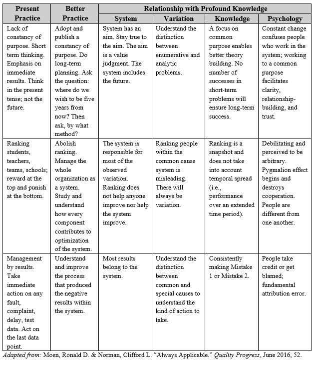 Table 1. Transforming Faulty Practices Using Profound Knowledge