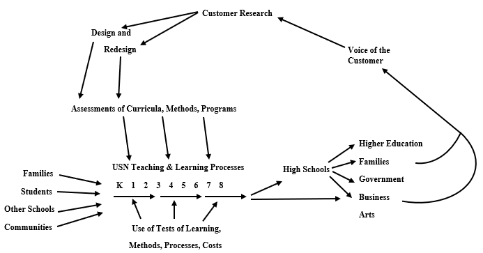 Viewing the USN middle school as a system as displayed in Figure 2 opens numerous possibilities for improvement beyond simply working to improve the individuals who work in the school. In fact, it would be far more productive to work to improve the system in which the people work rather than solely focusing on the individual educator. To do this it is helpful to see, understand, and improve the larger system in which the school operates. Deming stressed the following: