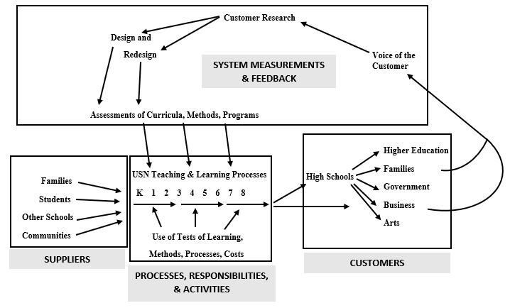 Suppliers are the inputs to the system. In the case of schools, this includes the families, other school districts, and communities from which students come. The processes, responsibilities, and activities are the throughputs in the system. In schools, these largely are made up of the teaching and learning processes that take place in classrooms. The customers receive the outputs from the system. Families are customers of the school system, but so are high schools (USN is a K-8 system) and other parts of society such as the business and arts sectors. The fourth and final component is the system measurements and feedback that inform the design and redesign of the school system.