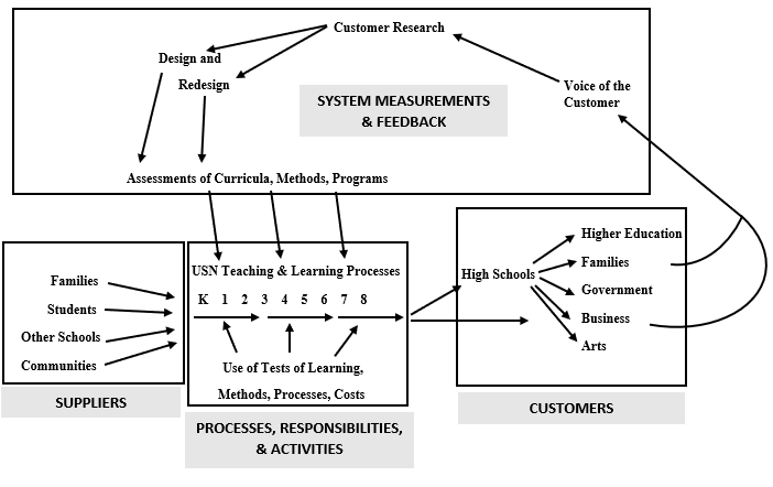Figure 1 illustrates K-12 education as a system that produces knowledge and skills. An important distinction is that what is being produced is high-quality learning (i.e., skills and knowledge) and not the students themselves. Like the performance of production workers, most of the differences in achievement and test scores at the individual student level are caused by sources of variation embedded within the complex and dynamic system in which they are being educated. Peter Scholtes gave us a very useful way to think about this dynamic: