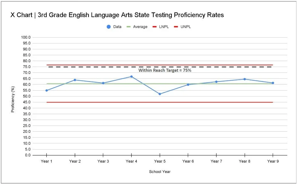 For example, let’s say you’ve set a target that 75% of the students at your school will score proficient or higher on the 3rd grade ELA state test. Your school’s hypothetical rates for the last nine years are illustrated in the process behavior chart below.