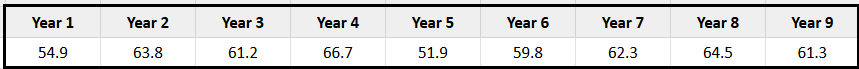 The average rate for the nine years of data is 60.7% as illustrated by the green central line.